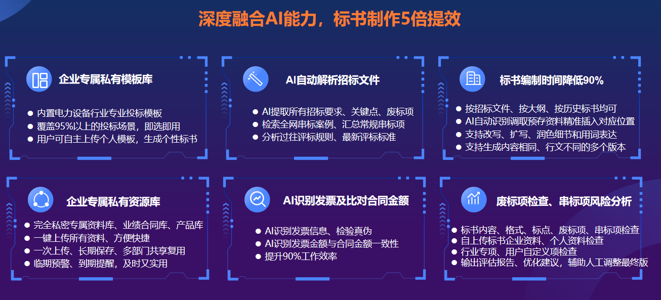 【紫标】基于DeepSeek大模型满血版和通义千问Plus,将最新AI技术与招投标场景相结合,围绕“五倍速编标 、一人一天一标”的目标,从投标项目管理、各类资质材料管理、AI解析招标文件关键点和废标项、AI生成大纲和标书,到AI文字校对、专项检查、废标项检查、结构性PDF文档一键转换,再到报价测算小工具、在线协同编标和跨部门协同、标书审核等细分场景,进行拆解和技术赋能,让AI替代人工完成重复且耗时的工作环节。